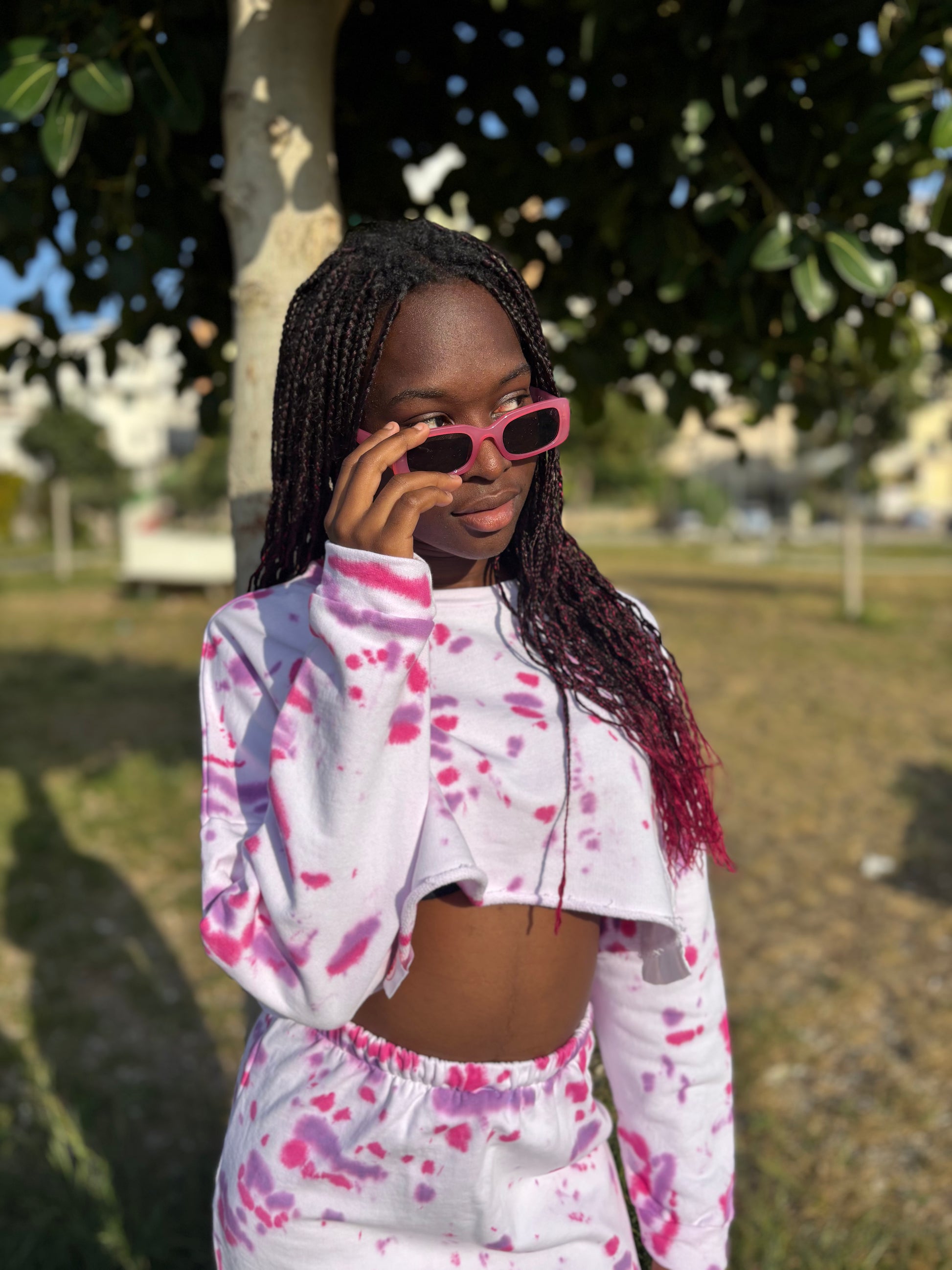 Felpa cropped in cotone con pattern tie-dye e dettaglio tasca sul fondo.